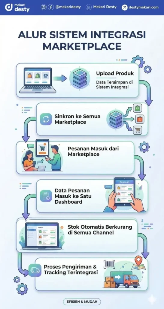 Alur ini menunjukkan bagaimana seluruh proses bisnis online dapat berjalan otomatis tanpa harus dikelola satu per satu di setiap marketplace.