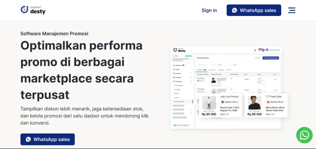 Mekari Desty adalah software manajemen marketplace & toko offline bagian dari ekosistem software terintegrasi Mekari yang menyediakan fitur omnichannel (pengaturan stok, data produk, promosi, proses pesanan, kelola multi gudang, laporan penjualan, integrasi & platform), serta sistem kasir (POS) dan manajemen chat.
