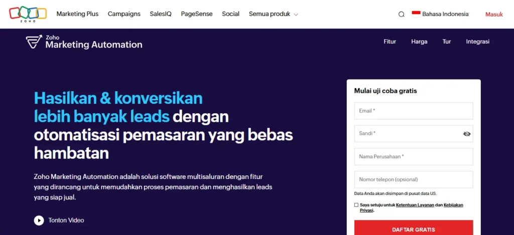Zoho menyediakan fitur automation marketing yang membantu mengelola leads dan campaign dalam satu platform.