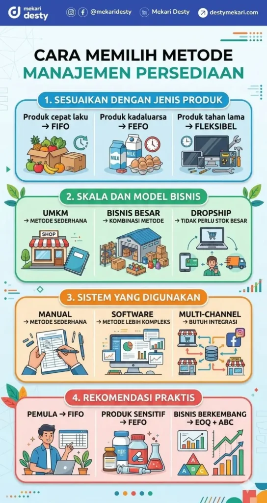 Berikut panduan sederhana yang bisa Anda gunakan untuk memilih metode manajemen persediaan yang cocok dan sesuai dengan kebutuhan: