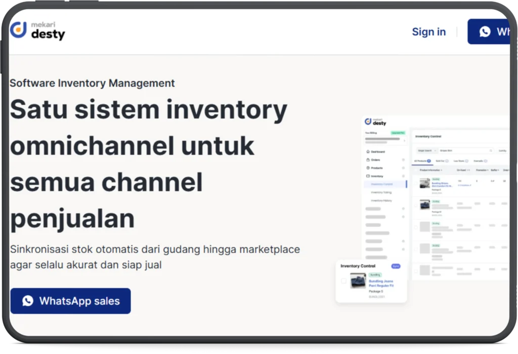 Mengelola stok secara manual tentu bisa menjadi semakin kompleks seiring berkembangnya bisnis. Untuk itu, Anda bisa memanfaatkan software manajemen inventory Mekari Desty, yang membantu mengelola persediaan secara lebih praktis, mulai dari pencatatan stok, sinkronisasi penjualan di berbagai channel, hingga monitoring stok secara real-time.