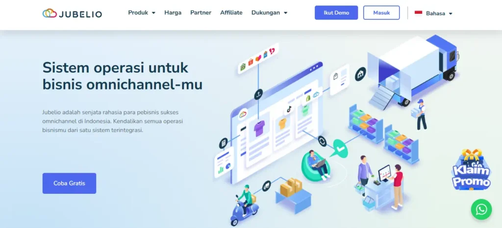 Harga: Harga Jubelio umumnya mulai dari ±Rp2 jutaan per bulan (custom tergantung kebutuhan dan skala bisnis).